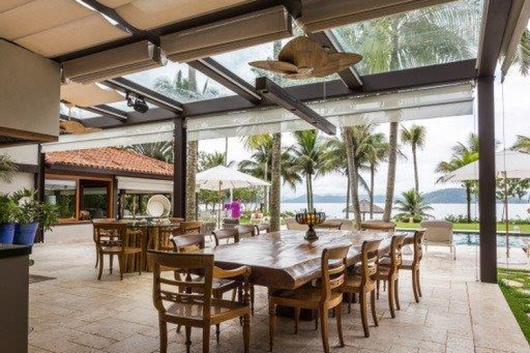 Todo o espaço da churrasqueira foi refeito e a cobertura de palha foi substituída por uma estrutura metálica com vidros, persianas e toldos.